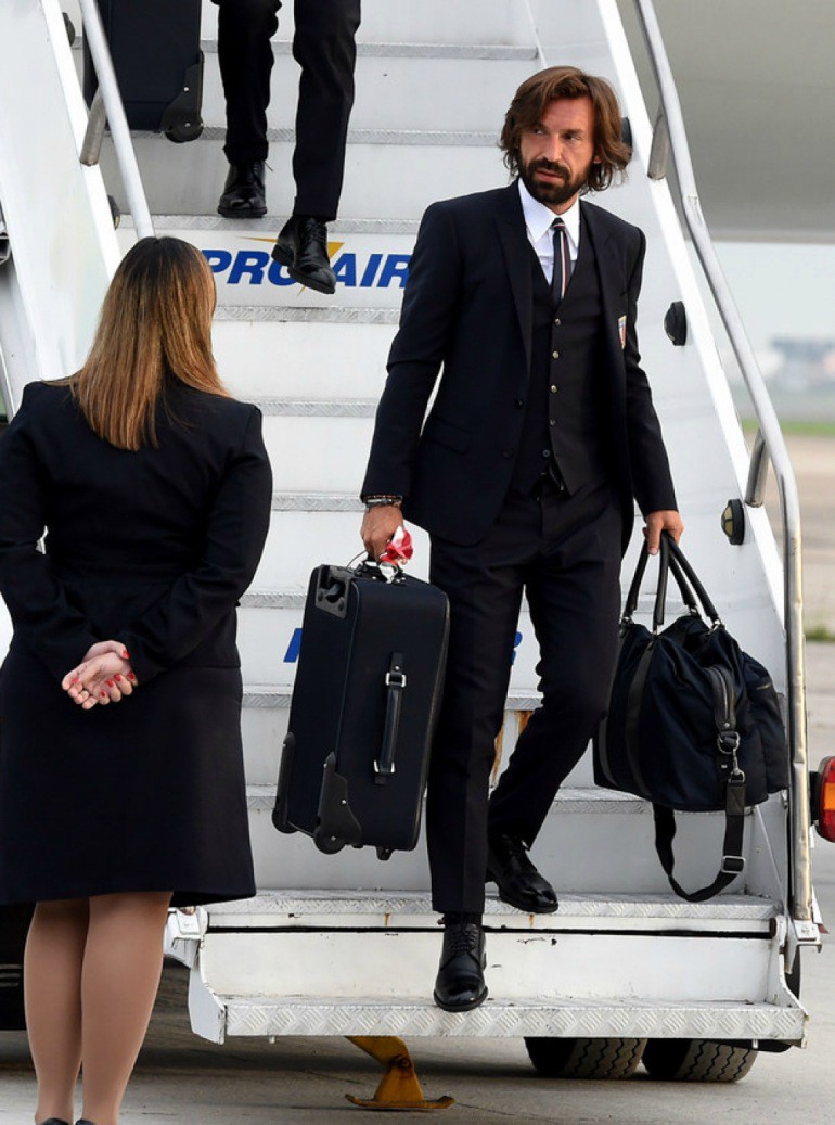 Andrea Pirlo, với mái tóc lãng tử và bộ râu thương hiệu cũng sở hữu phong cách thời trang độc đáo. Trong hoạt động thường nhật, danh thủ Italy trung thành với quần jeans và áo phông. Nhưng khi phải di chuyển khi thi đấu, anh luôn lựa chọn các bộ suit thời trang.